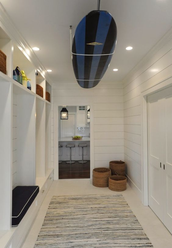 - Put away all of the summer gear; oars, life jackets, bathing suits,beach bags, beach towels, etc and store safely for next year. Maybe just hide in the garage out of sight, cause I am sure that you will still be spending time still at the beach looking for shells or having a few more boating adventures. (or as in the image above - store your surfboards on the ceiling!)