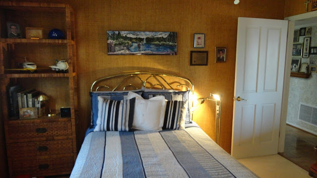Nancy: The room is actually not finished in these photos. We are currently re-upholstering a chair for the other side of the room. The new headboard is still coming in also. The rattan furniture was moved to the other side of the room and we picked a campaign style for the new pieces with brass accents that work with it.